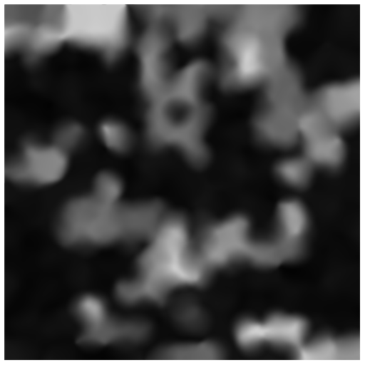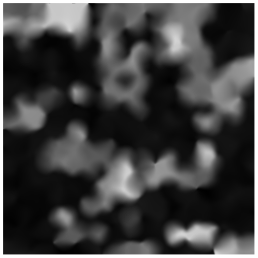 After creating all of the height points, we can generate the height map by taking a weighted average of nearby points for each location on the map. An important part to keep in mind is the region padding again. Since we currently have 1 region of padding, and want a region to only be effected by its close neighbors, we don’t want a height point to effect an area more than 1 region away from it. This can easily be accounted for when taking the weighted average by giving the point an implied radius of 1 region size. If we divide the distance from the height point with the implied radius, we get 0 if the position is directly on the point, 1 if the position is on the outer radius, and more than 1 if further out. We can turn that into a good weight value if we subtract that number from 1 so that there’s a weight of 1 when directly on the point, and 0 on the edge. Although don’t forget to ignore negative weights once past the radius… If we create an image where white is high up, and black is far down, we can see what the height map looks like with a variety of points per region: