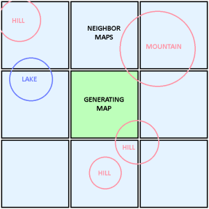Lets go back to the seamless border problem. Imagine we are generating a segment of our infinite map. We seed for this map, then generate all of the features included in this area. A feature could be a hill, mountain, lake, river, or anything really. Only generating the map using its own features would cause seams between neighboring maps. This is because a feature is big enough to effect neighboring maps, especially if they are close to a border.