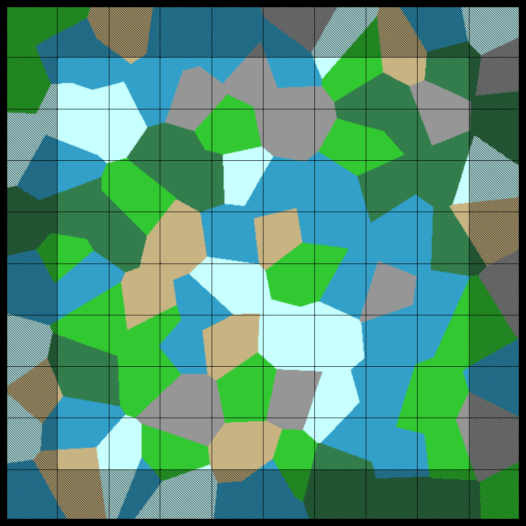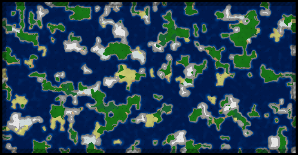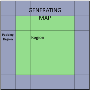 The Green region of our map corresponds to the “usable” area of the map. While the Grey region is padding area which is very likely to effect the usable region. The padding regions is area outside the map, aka the neighboring maps, but now a significantly less amount. Rather than seeding for the whole map, we can seed per region and generate a small amount of terrain features in each region. This means that most of what we generate will be effecting the usable region. In the example picture, there is a 4×4 of inner regions, but that can be increased in order to minimize the proportional area of the padding.