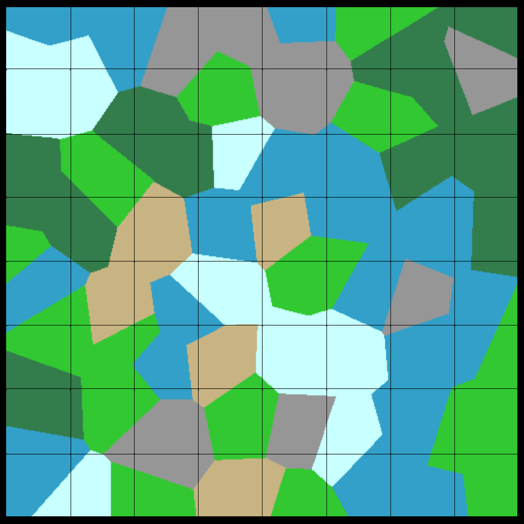 After creating all the regions, we can determine the biome for every position/pixel on the map depending on what region it is closest to. Normally that would just be the biome of the region-grid its inside, but since we defined a central position randomly in the grid it’ll create a voronoi diagram. Creating an image based off of the region of each position on the map would look something like this: