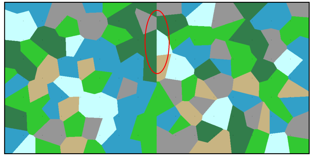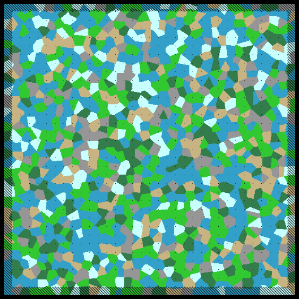 As you can see, without padding there is a very noticeable seam along the border between two maps, but the padding regions fix this. Additionally, the reason we only need 1 region of padding around the map is because its impossible for a voronoi cell to to effect a cell two cells away from it, otherwise we would’ve needed a width of 2 regions for padding.