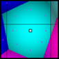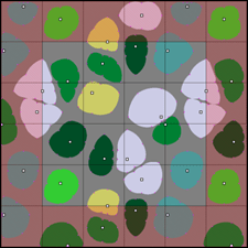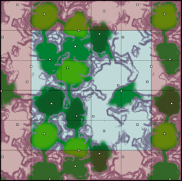 Next, I chose a biome to represent the region, and create a new map to store the biome of each location. For each pixel, the angle from the region’s center is calculated. Using that angle, we can get a distance from the appropriate vertices of the polygon and compare it with the locations distance that was stored when creating the Voronoi Diagram. If the pixel’s distance from the center is less than the polygon, then we know the pixel is inside the polygon. The result is a more organic shape than the original Voronoi Diagram that looks like this:
