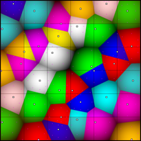 Since my goal was to create a more RPG inspired world, I knew that I wanted to generate areas separated in some way so that they are distinct. My vision of this was different biomes separated by mountains, with paths connecting regions together. An easy way to do this is by generating a Voronoi Diagram. Doing this creates the foundation for these areas, and as part of the calculation, the distance from the center point is stored which will be used for later procedures.