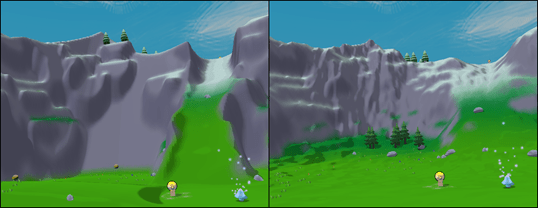 Hydraulic erosion was used on the final heightmap to give the terrain a more natural look. I used Sebastian Lague’s video on the subject for a high concept introduction and implemented it from there. With my implementation of hydraulic erosion variables can be adjusted so accuracy can be traded for runtime in order to find what worked best. In order for generation times to be short, each simulated drop is really strong so that less has to be simulated to get the desired effect. Despite the accuracy tradeoff, the terrain still gets a significant visual improvement. Here is a before and after comparison: