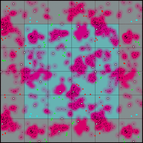 A useful map that I thought of while working on object placement was an “object density map”. The idea is that when large objects are placed, they mark this map and the area around them. This allowed me to avoid placing enemy spawners in heavily forested areas. This is what the map looks like: