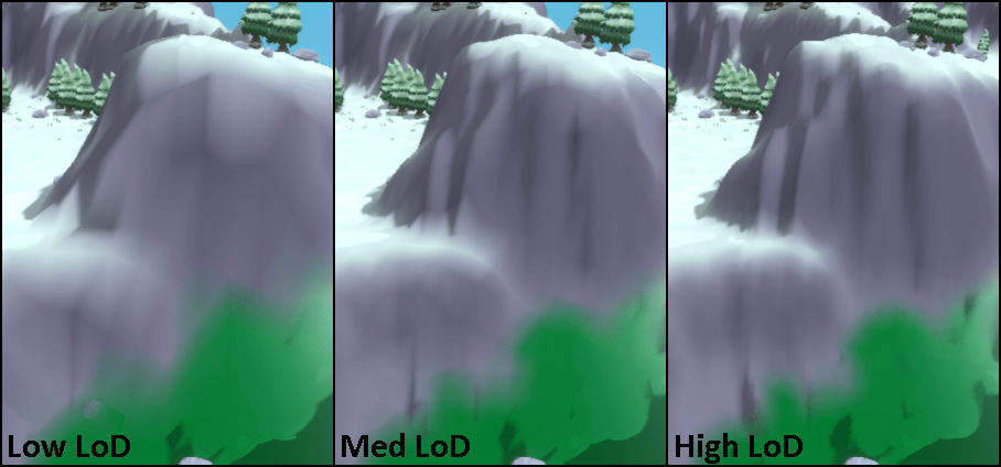 With the all of the necessary maps finished, the mesh for the heightmap can be created. In order for the world to be scalable, the world is divided into chunks. Each chunk starts as a basic vertex plane, where each vertex in the plane corresponds to a pixel in the maps. from this, the vertices read from the heightmap to get their z value, the color map to get their vertex color, and the normal map to get the vertex normal. The process is repeated for 2 additional Levels of Detail, each cutting the dimensions of the plane in half, and averaging values of the previous LoD (normals are renormalized).
